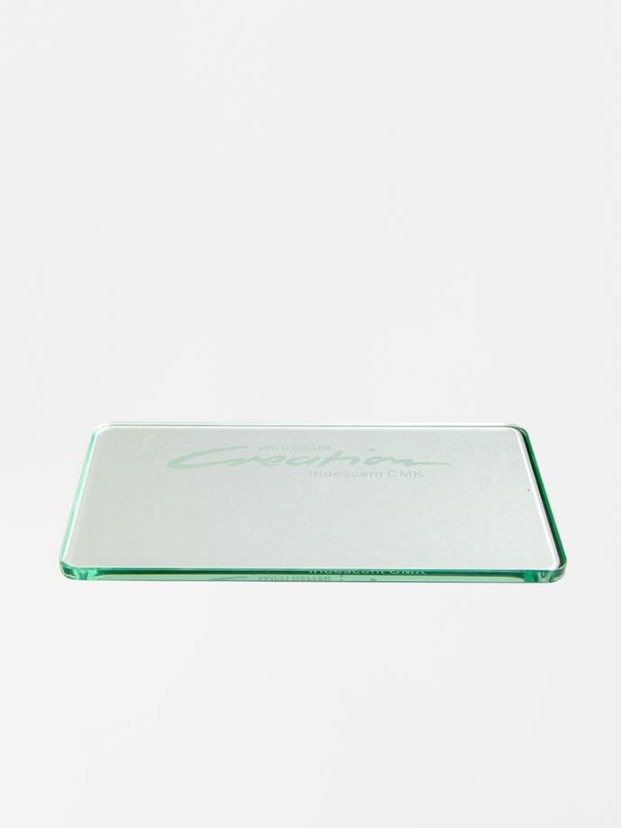Vassoio in vetro per la miscelatura tra masse ceramiche, supercolori e i liquidi di miscelazione Creation Willi Geller, ideale come superficie di lavoro. La struttura del vetro possiede una tecnologia iridescente che esalta la definizione cromatica dei colori miscelati, affinché il ceramista possa verificarne le singole sfumature.
