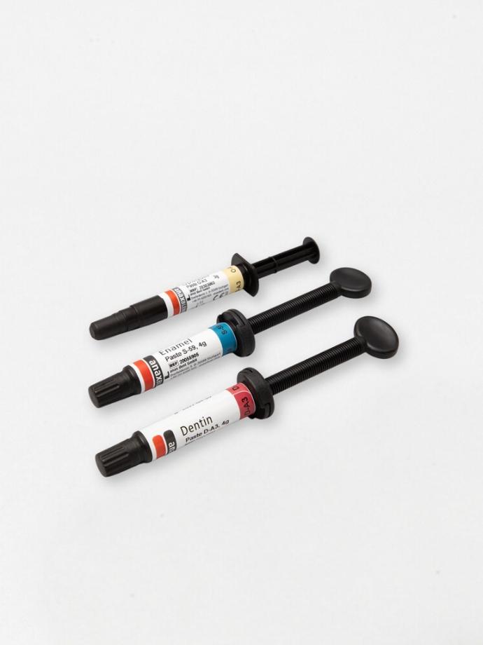 anaxblend è il sistema di rivestimento per restauri dentali a base di materiale composito che unisce masse in pasta di varie durezze con un'ampia varietà di masse fluide. Gli smalti anaxblend hanno una stabilità e una durezza simili allo smalto naturale. Questa caratteristica li rende più rapidi e più facili da lavorare, indipendentemente dal fatto che si scelga pasta o fluido. anaxblend può essere applicato sia modellando mediante tecnica di stratificazione, sia iniettato in fiasche o duplicatori anaxform. Il materiale fluido anaxblend è molto stabile e può essere utilizzato anche per iniezione.
