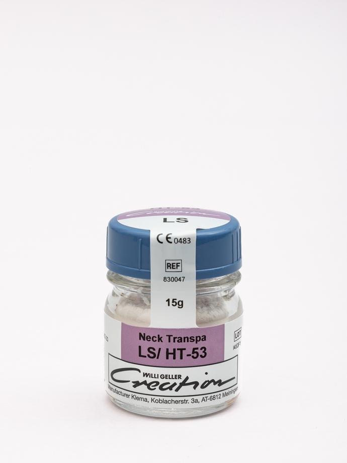 LS/ Neck Transpa è la massa ceramica di Creation per disilicato di litio che viene applicata per mantenere un effetto naturale e leggermente traslucido sul colletto, simulando la transizione tra la gengiva e il restauro protesico.
