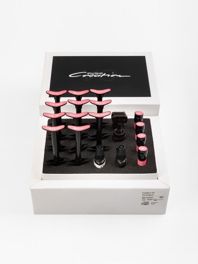 VC/ Gengiva kit comprende tutte le masse in pasta per riprodurre fedelmente tutte le aree delle gengive. I materiali sono disponibili in tre viscosità (liquido, pastoso e gel) - per un primer omogeneo, una facile applicazione, miscelabilità e spessori di strato molto sottili.