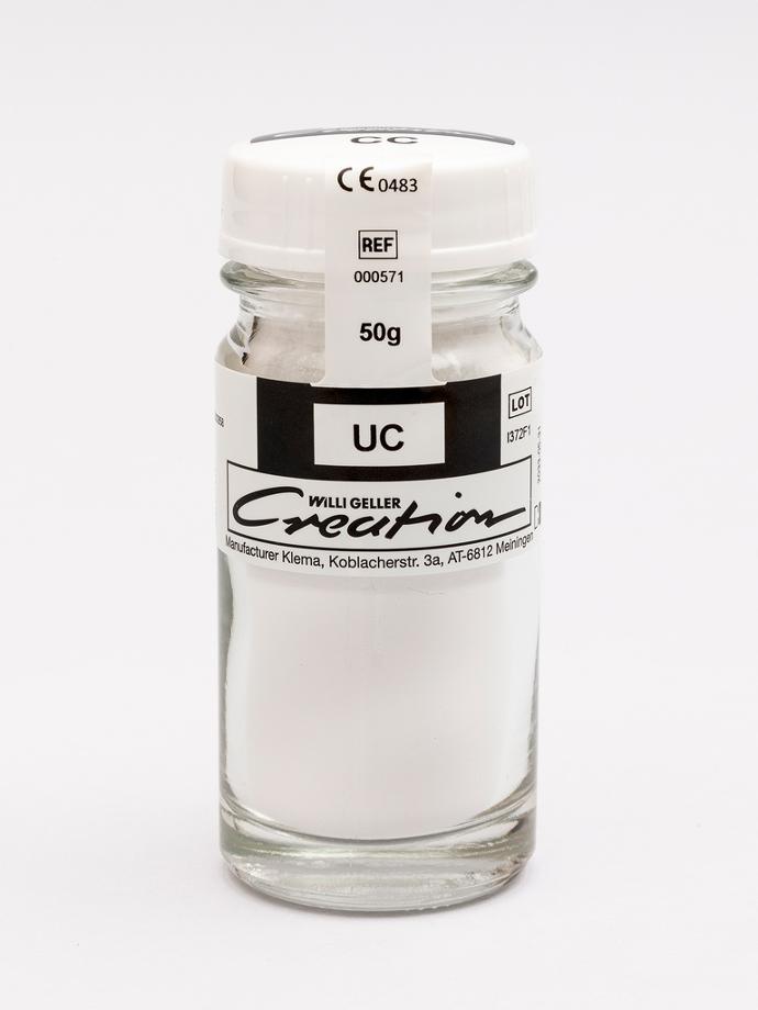 CC/ Clear è una massa in polvere trasparente di Creation Willi Geller per i restauri in metalloceramica ideale da utilizzare come rivestimento nelle aree incisali del dente, in modo da conferire un aspetto traslucente alla stratificazione più sottile.